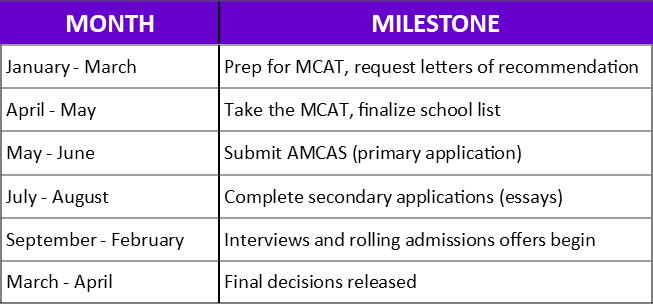 Unlike college admissions, the med school application process starts early and the timeline matters. Medical school admissions are rolling, meaning applicants who apply early tend to have better outcomes.